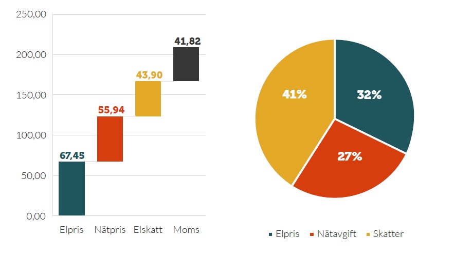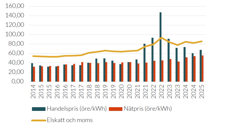 Förenklat går det att dela upp kostnaden för el i fyra olika delar: energiskatten på el, elnätsavgifter, priset på el, och moms. Momsen tas ut på elpriset, elnätsavgifter och energiskatten. I den här rapporten kommer energiskatten på el och momsen på energiskatten att förenklat benämnas som ”elskatten”. Totalt uppgick skatteandelen, för företag med en årsförbrukning av el mellan 20 och 500 mWh våren 2025, till 41 procent. Mindre än en tredjedel var kostnad för den faktiska elen.