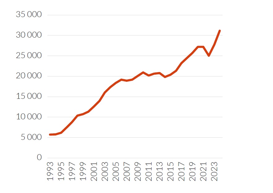 Figur 7. Inbetald energiskatt på el, nominellt värde, SCB 2025