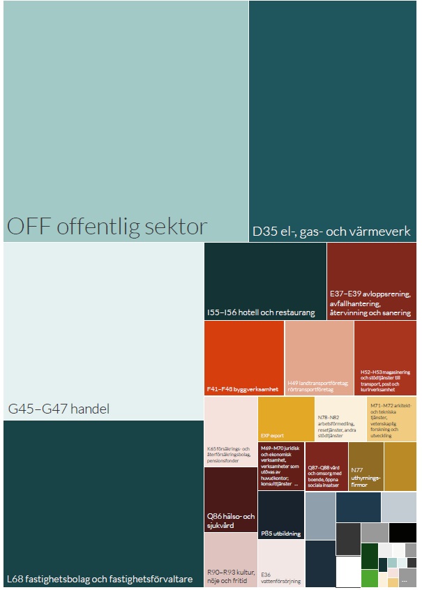 Figur 9. Betald energiskatt på el, efter SNI, SCB (2025). Rutans storlek är också i relation till inbetalad energiskatt på el. Sektorerna med störst elskattekostnader namngivna.