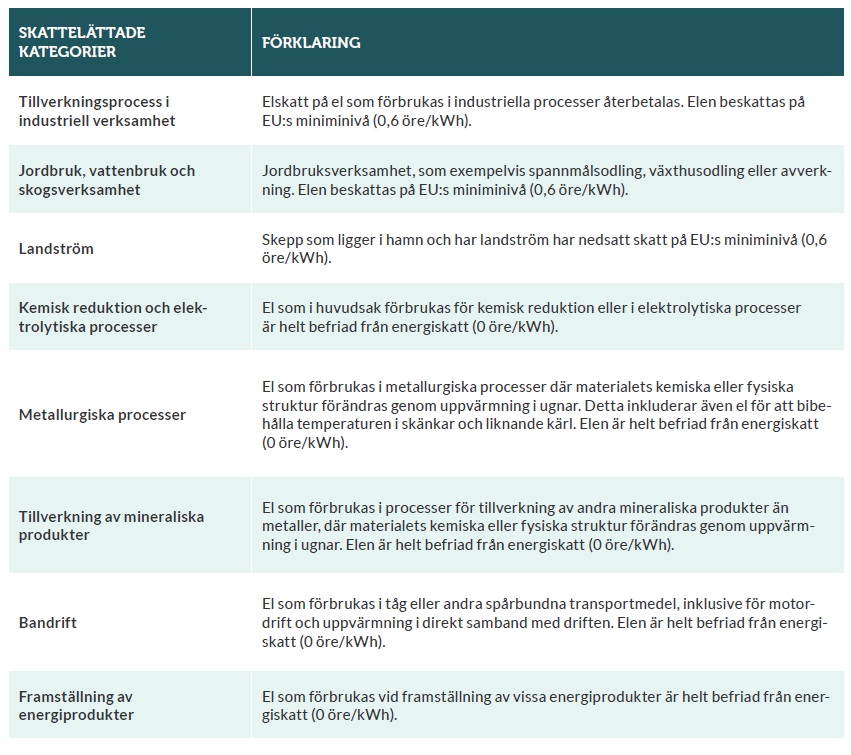 Tabell 1. De kategorier av verksamheter som av olika skäl får lägre elskatt idag finns förklarade i följande tabell, baserad på Skatteverkets sammanställning. Elektriska processer som omvandlar energin till annan form är generellt också skattebefriat, exempelvis vätgas som framställs genom elektrolys.