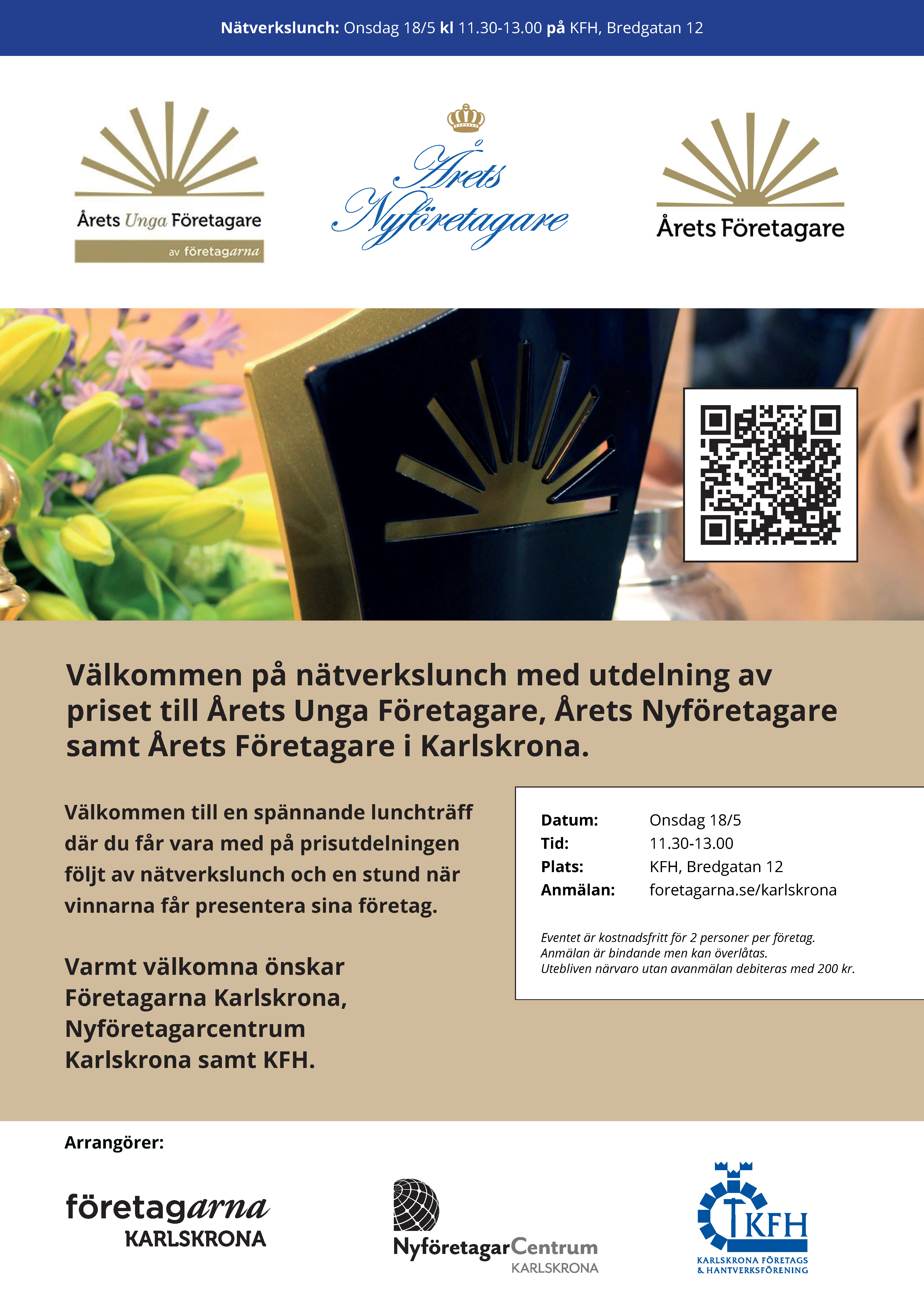 Välkommen på nätverkslunch med utdelning av priset till Årets Unga Företagare, Årets Nyföretagare samt Årets Företagare i Karlskrona! Information Börjar 2022-05-18| kl. 11:30 Slutar 2022-05-18| kl. 13:00 Plats KFH, Bredgatan 12 Anmälan önskas senast den 16 maj och du anmäler dig via formulär till höger, om du anmäler via mobil, scrolla ner. Taggar Karlskrona