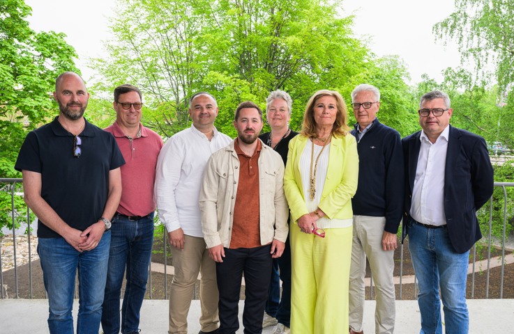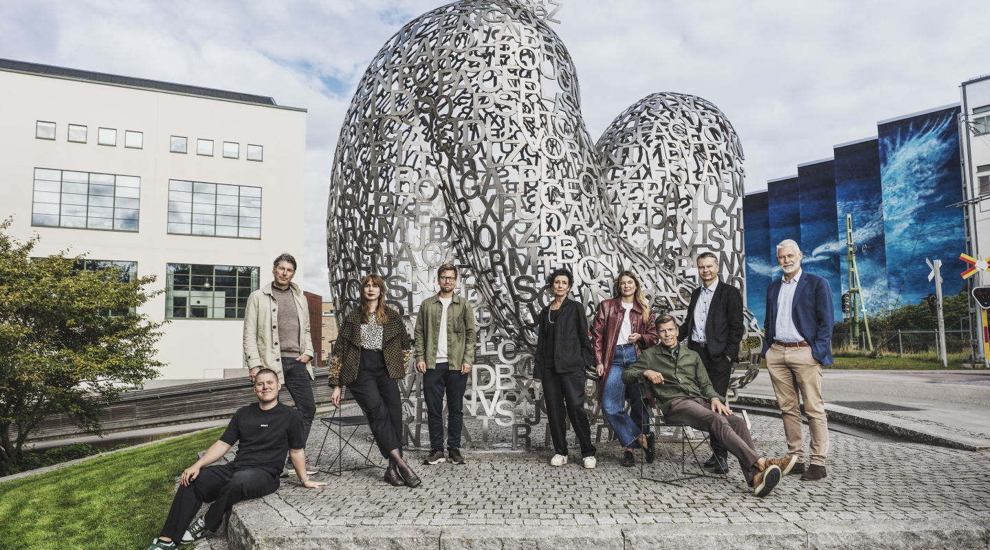På bilden från vänster syns: Erik Alsin (sittande), Anders Hell, Louise Björnram, Andreas Åkervall, Helen Emanuelsson, Caroline Wallin, Dennis Lénberg (sittande), Ulf Olsson (kommunstyrelsens ordförande) samt Niklas Odén. Bilden är tagen av fotograf Mikael Göthage utanför Textile Fashion Center vid Högskolan i Borås med skulpturen ”House of Knowledge” i bakgrunden.