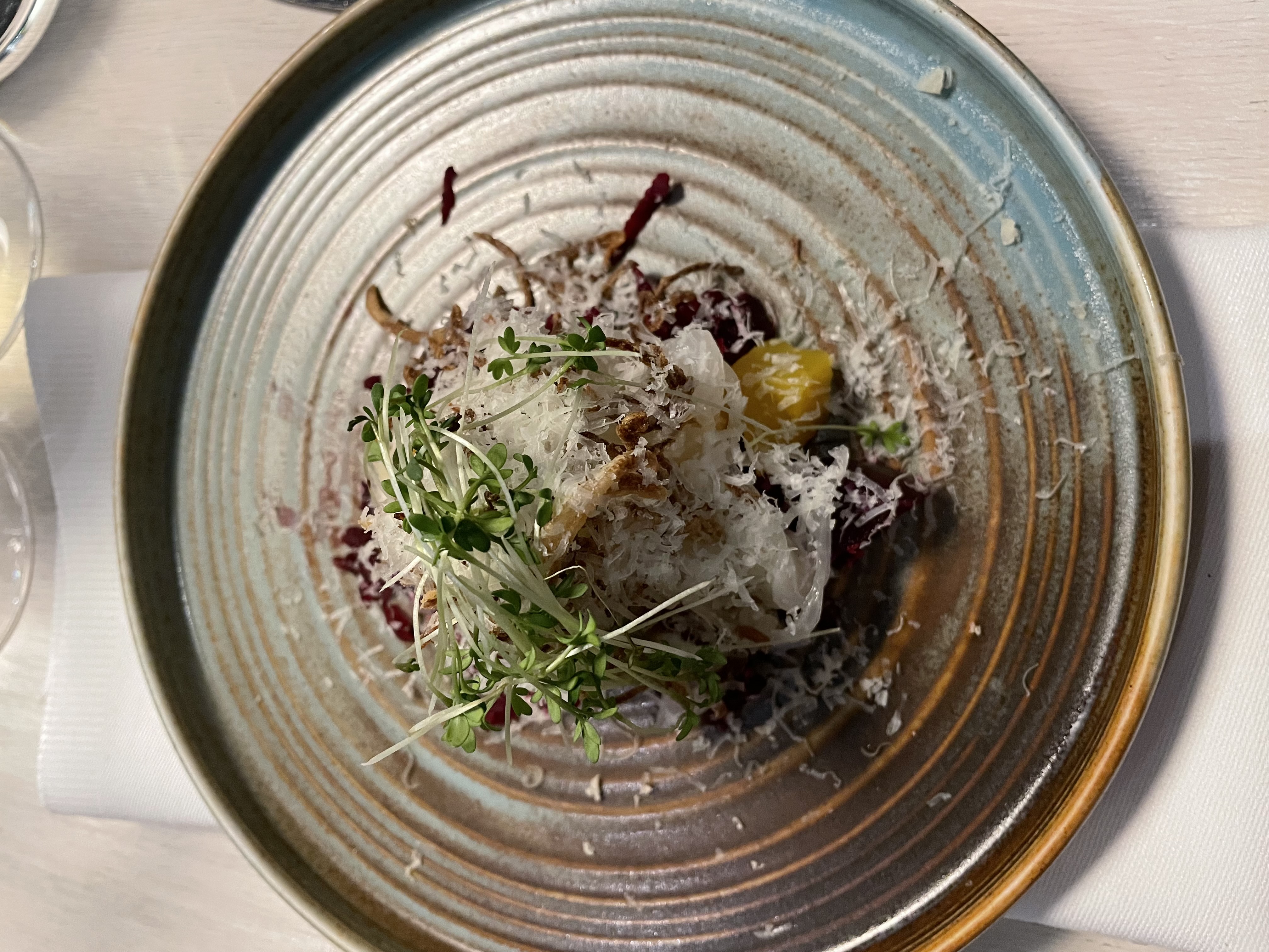 Efter fyra rätter och två aptitretare var magarna fulla. Maten var lika god som den var fint upplagd. Vid det ena bordet satt tre personer som hade vispat varsin majonnäs, det utlystes snabbt en majonnäs-tävling. Efter en del diskussioner utsågs en vinnare och det firades med lite jonglering av bestick och vedträn.