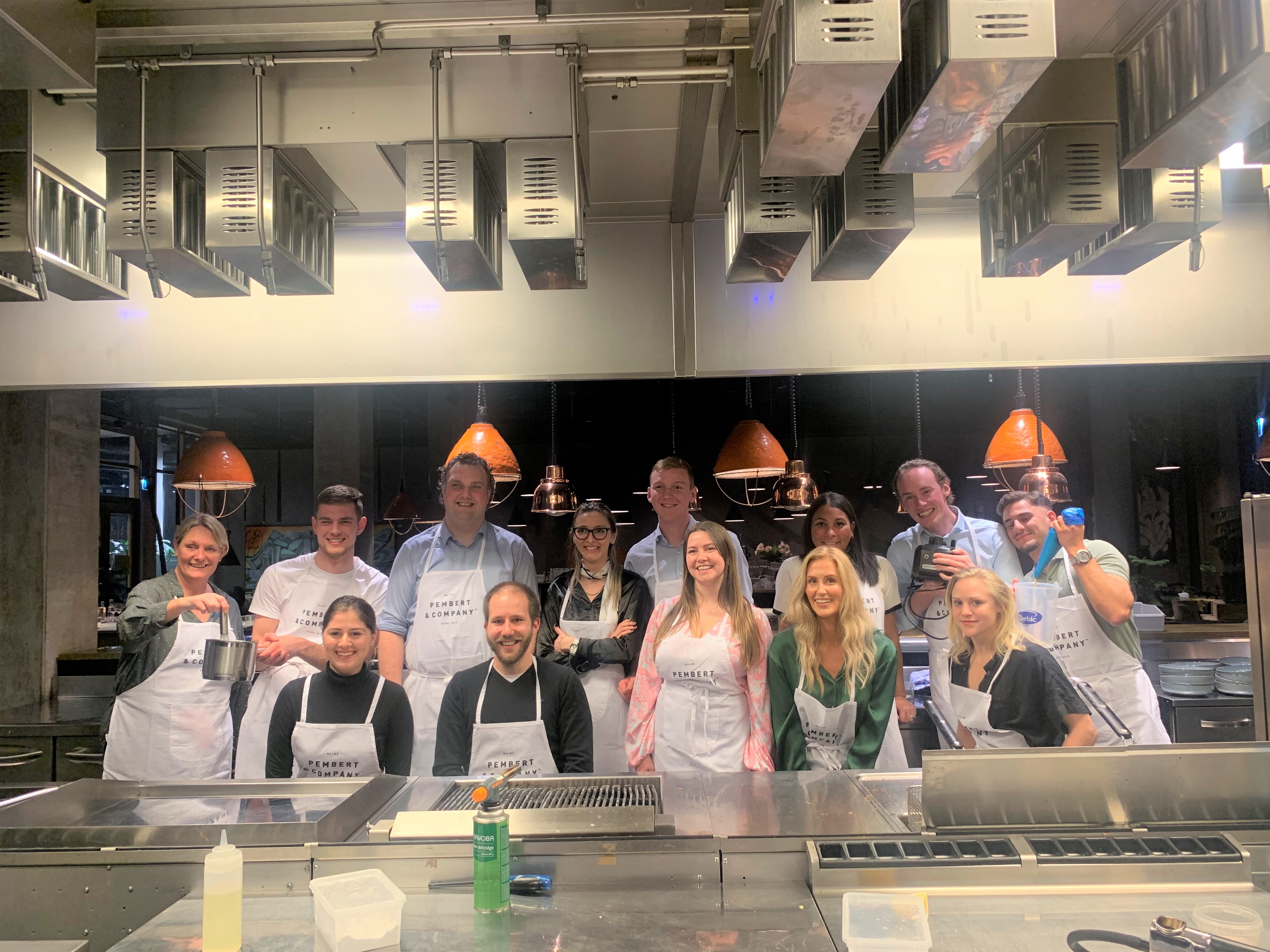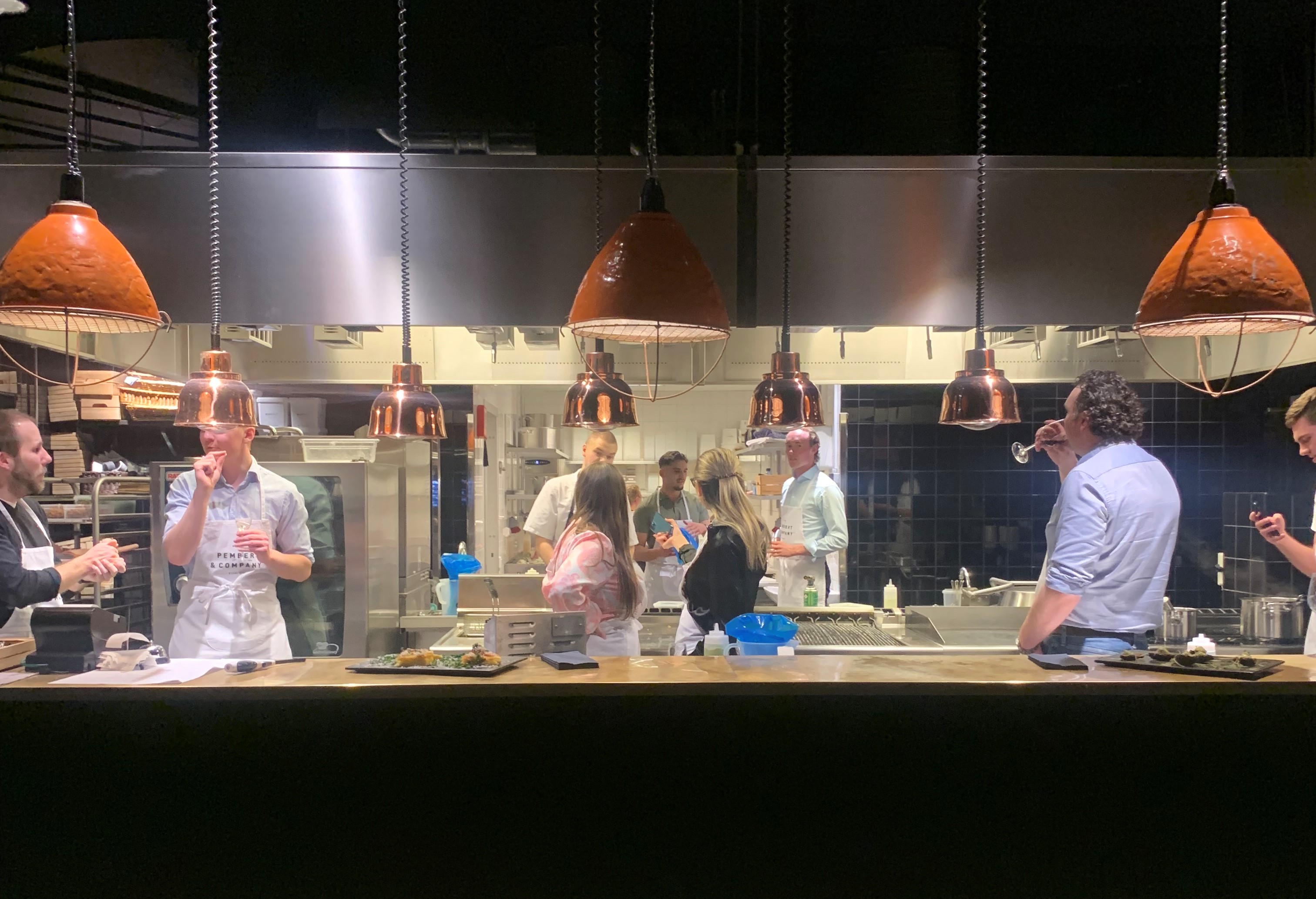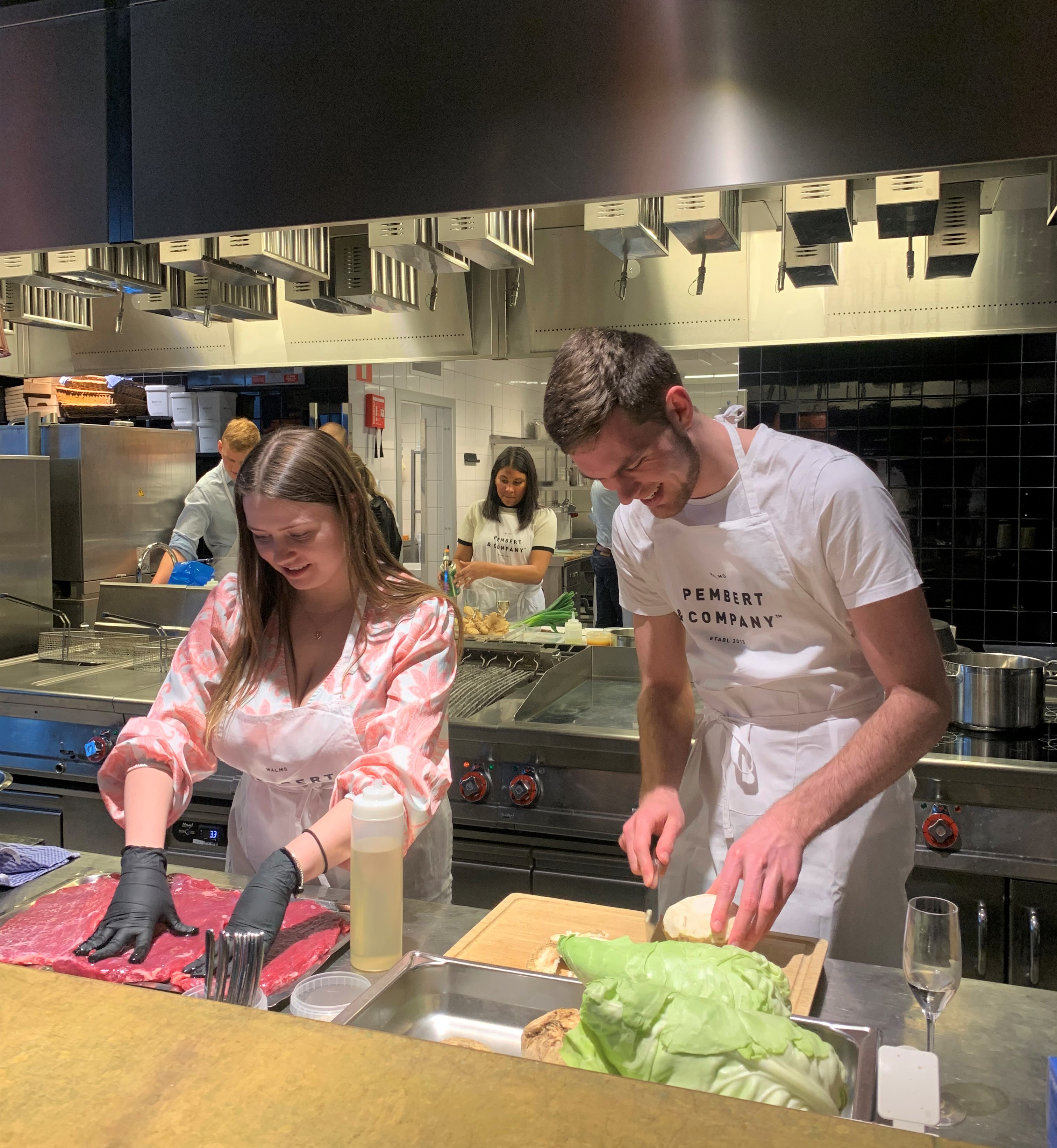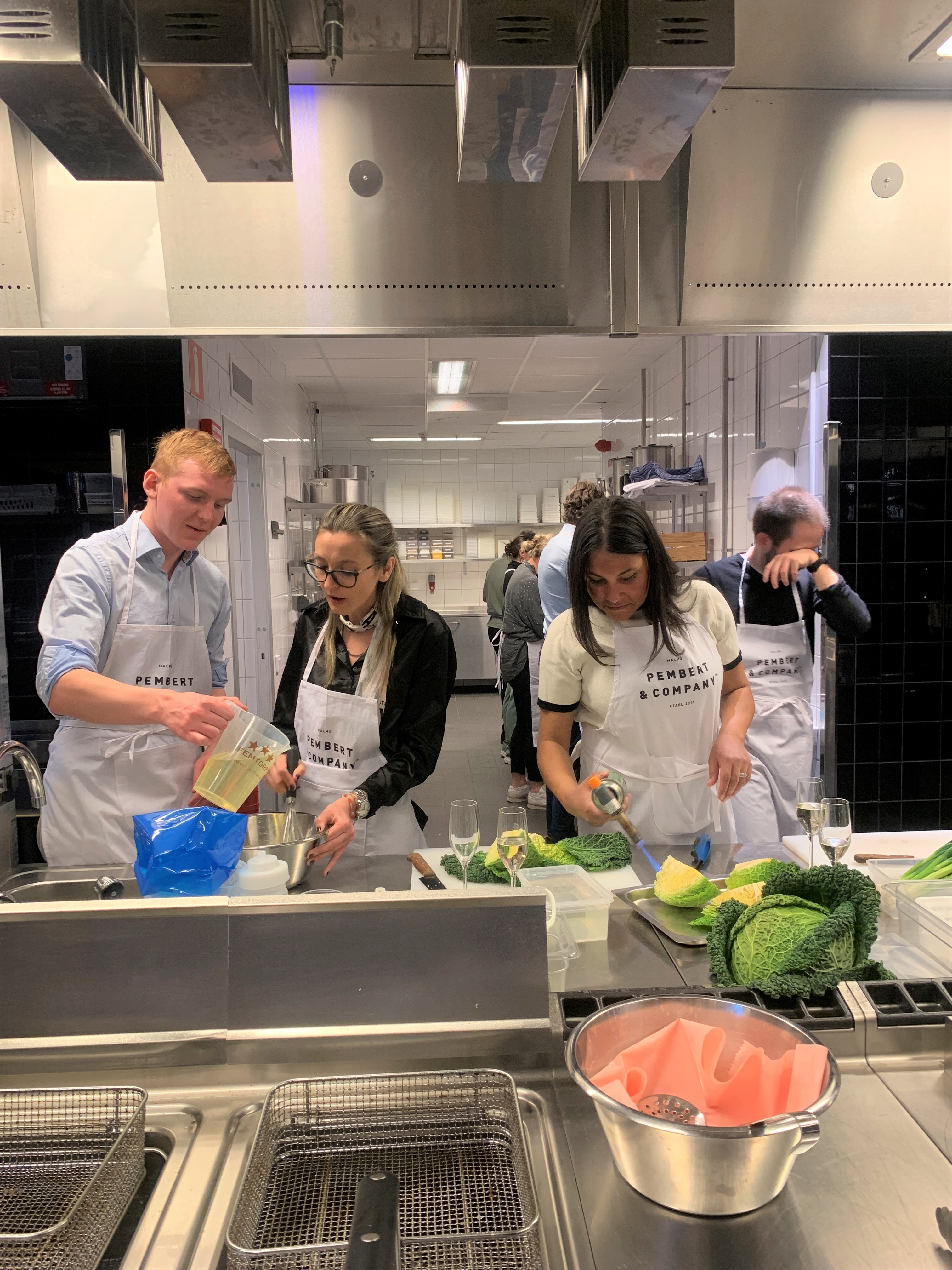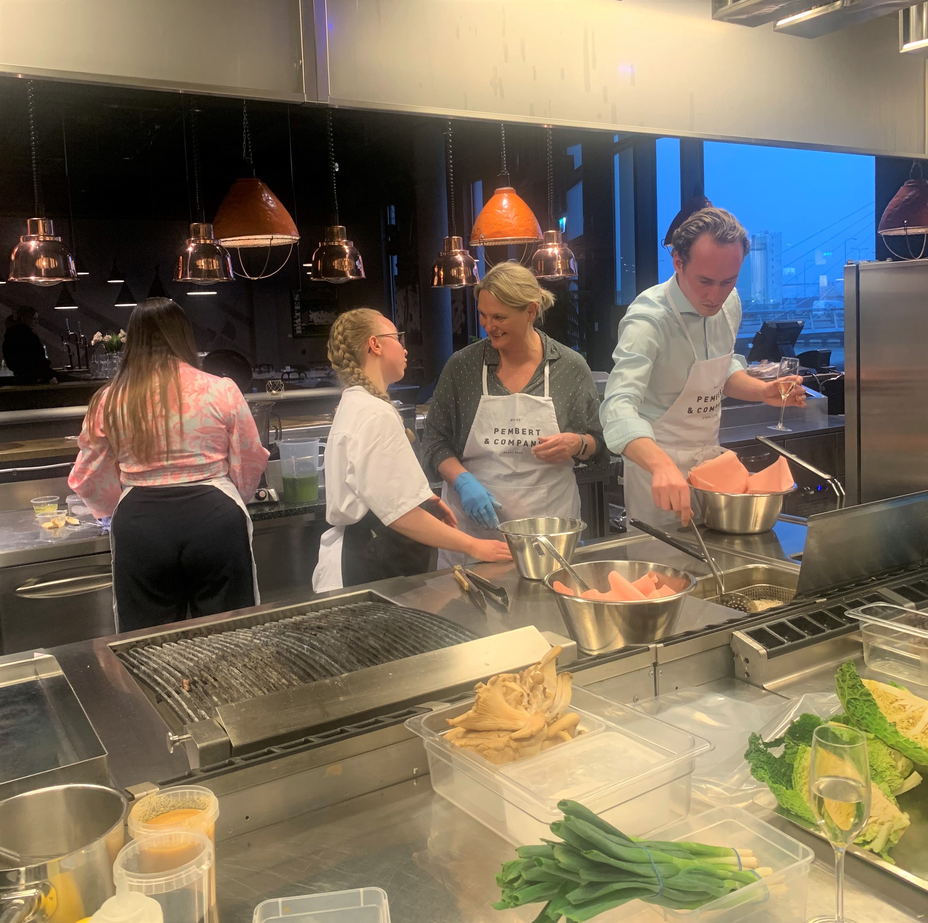 Upplägget var enkelt: för att få äta maten skulle man tillaga den först. Så efter en timmes mingel med fantastiska aptitretare och några glas bubbel var det dags att delas in i lag, på med förkläden och slussas in i det stora fina köket. Inne i restaurangköket befann sig rutinerad och engagerad personal som med en stor portion tålamod och desto större dos humor stod redo hjälpa till. Kockarna vägledde de olika lagen hela vägen från råvara till färdiga rätter.