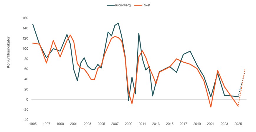 Småföretagskonjunkturen i Kronobergs län har försvagats under året men utvecklas ändå betydligt bättre än riksgenomsnittet. Länets konjunkturindikator ligger på +6, jämfört med rikets –13, vilket placerar Kronoberg bland de mest motståndskraftiga regionerna i Sverige.