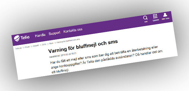 Telia själva varnar för bluffen på sin hemsida och meddelar att bluffmejl, sms och falska kundundersökningar med dem som avsändare har funnits länge. Ofta är de väldigt lika Telia, TeliaSonera eller TeliaCompany med rätt logotyper och färger.