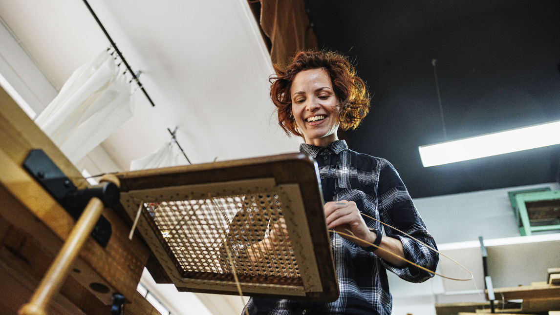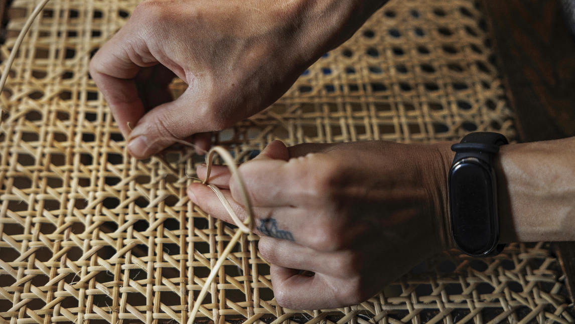 Pernilla ägnar sig också åt stolsflätning, något som egentligen görs av korgmakare, men i takt med att de dör ut får möbelrestaurerare och tapetserare ta vid.