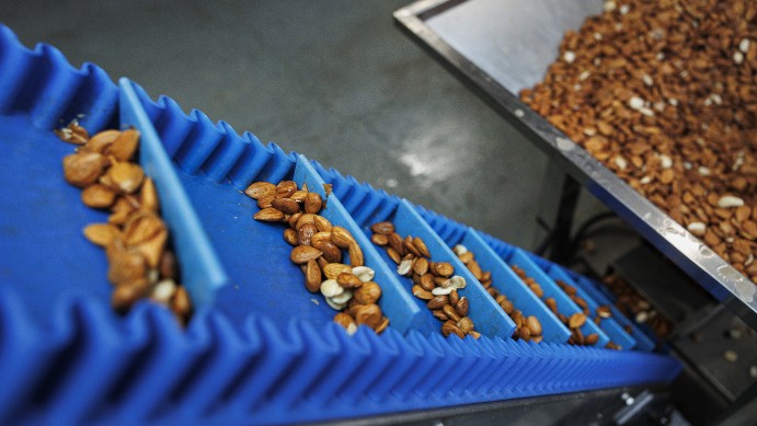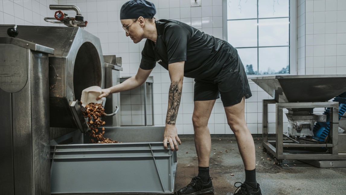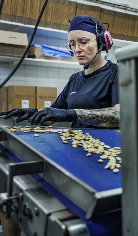 Tusentals mandlar dundrar fram längs ett blått transportband. Mandeln har precis skållats och skalats, men ingen maskin är perfekt. För att säkerställa kvaliteten måste Anna Valdén manuellt syna råvaran för hand och rensa bort enstaka skal och annat skräp innan mandeln är redo att valsas till mandelmassa.