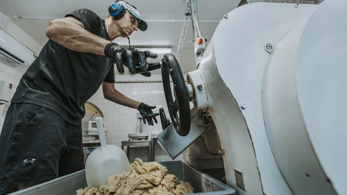 Dennis Valdén blandar socker och skållad mandel för hand. Sedan tar valsmaskinen över. Ju fler varv i maskinen, desto mer finmalen blir slutprodukten. De säljer både finmalen och grovmalen mandelmassa.