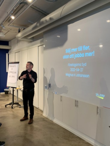 Magnus H Johansson pratade bland annat om det så kallade svarta hålet – kundens inkorg i mejllistan. Lösningen på problemområden så som svävande mejlkonversationer är att boka nästa steg i ”säljfabriken” och vara tydlig med att säga att nu bokar vi ett möte.
