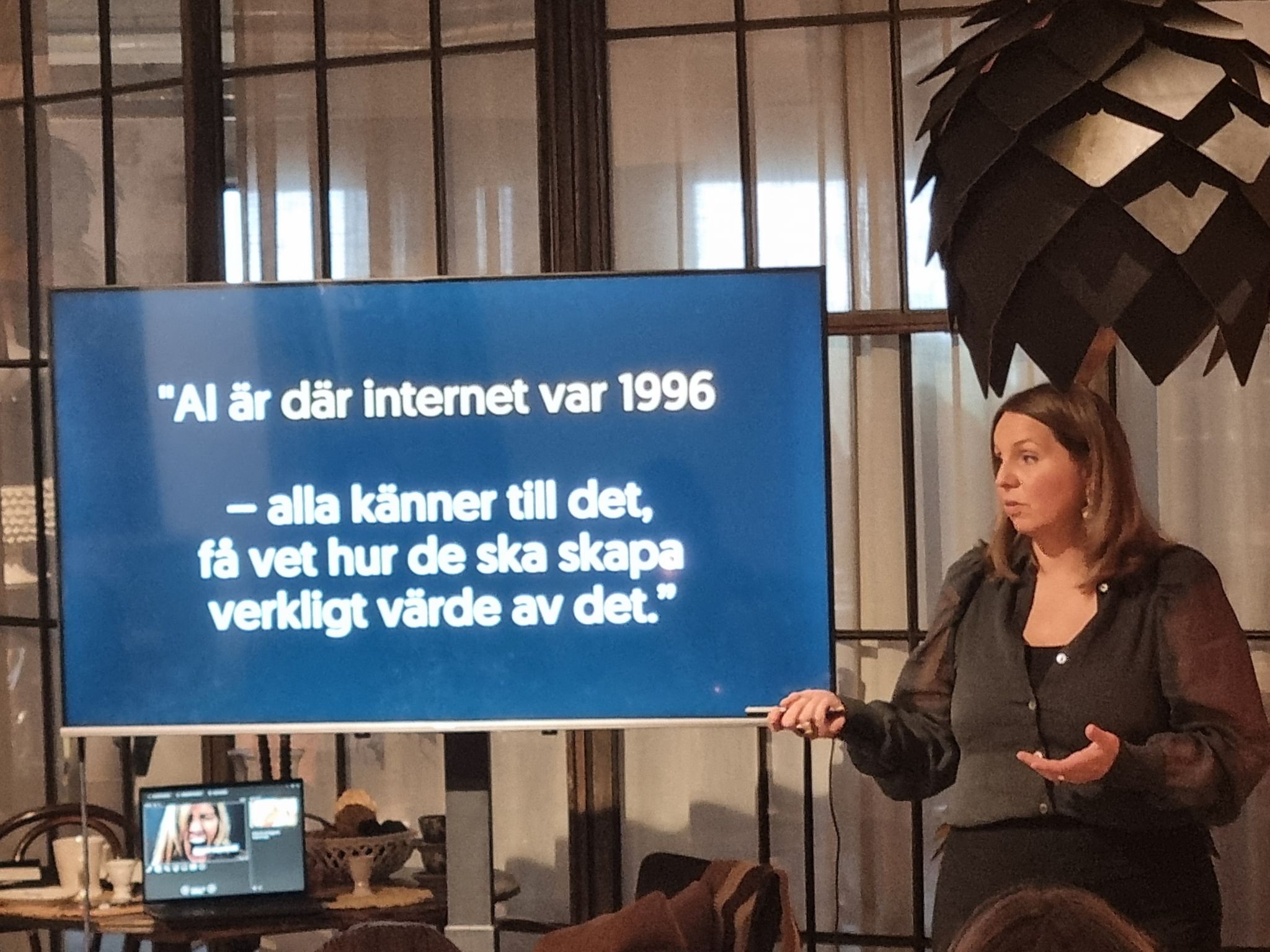 Kvällen fortsatte med en framtidsspaning av Anne-Christine Hertz från Axontech, som visade hur företag idag kan ”anställa” virtuella AI-assistenter – skräddarsydda för just deras bolag.
