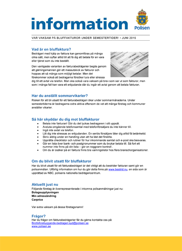 Nu är semestertiderna här och även den period då risken för att bli utsatt för fakturabedrägerier är som störst. Polisen har nu sammanställt information med konkreta tips och råd om hur man hanterar en bluffaktura.