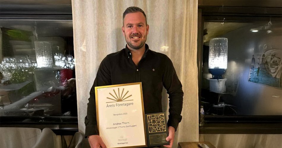 Årets Företagare 2025 trivs med rollen som företagare här i området. Han gillar också sitt yrke i en spännande och bred bransch. Med stenkoll på det mesta jobbar Andree Thorn och företaget AB J. Thorns Stenhuggeri långsiktigt med en positiv och lösningsfokuserad anda. En anda som har nedärvts genom generationerna. Där Andree är den femte generationen.