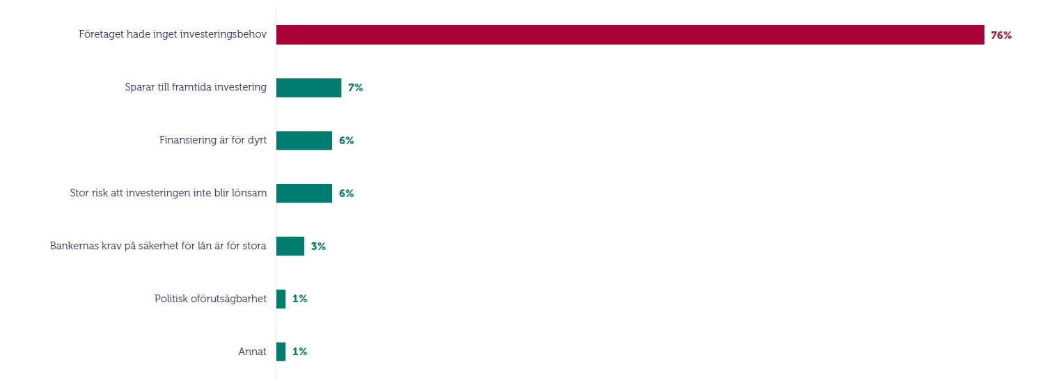 Det är ungefär lika många som svarar att de inte gjorde en investering för att de sparar till en framtida investering (7 %) som anser att extern finansiering är för dyr (6 %) eller att risken att investeringen inte blir lönsam är för stor (6 %).