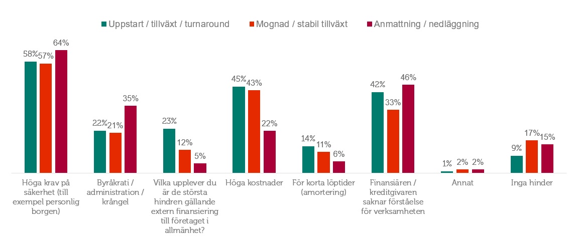 Nästan 9 av 10 företagare svarade att de upplever hinder gällande tillgången till extern finansiering. Fler svarar att höga krav på säkerheter, såsom personlig borgen, är ett stort hinder när det gäller extern finansiering (60 %) än de som svarar att höga kostnader är ett hinder (41 %).