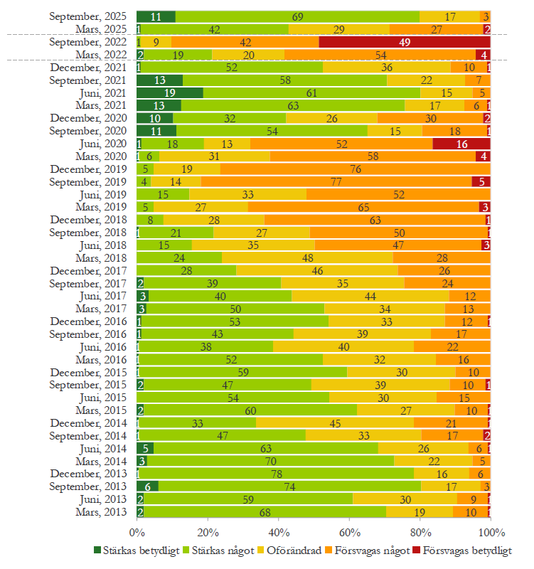 Vad är din personliga bedömning av konjunkturutvecklingen under det kommande kvartalet? Bedömer du att konjunkturen kommer att stärkas, försvagas eller vara oförändrad under fjärde kvartalet 2025?