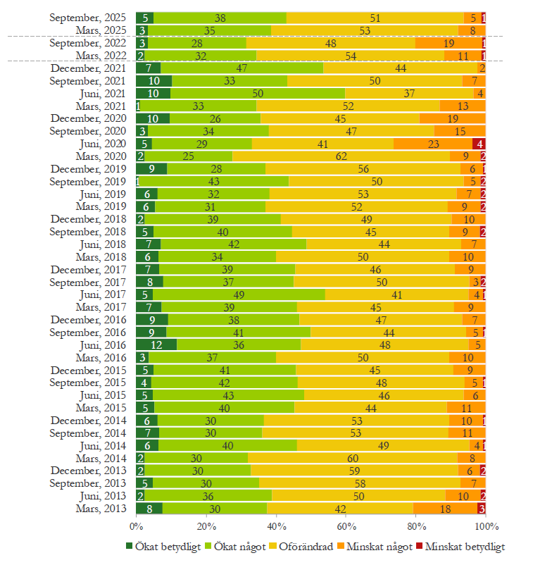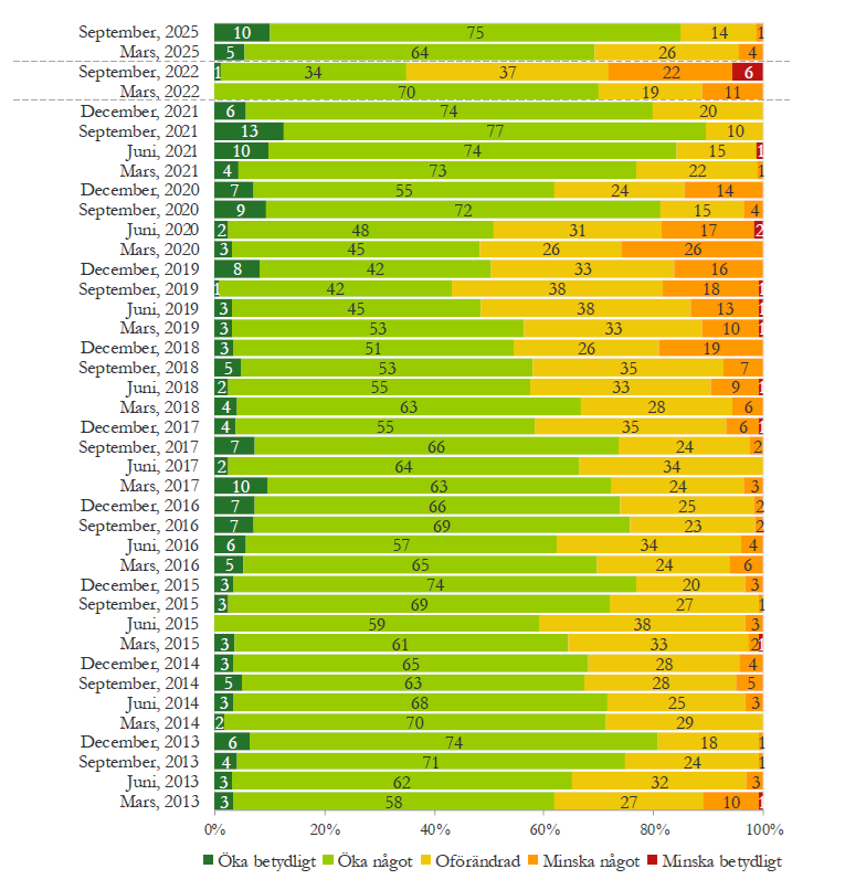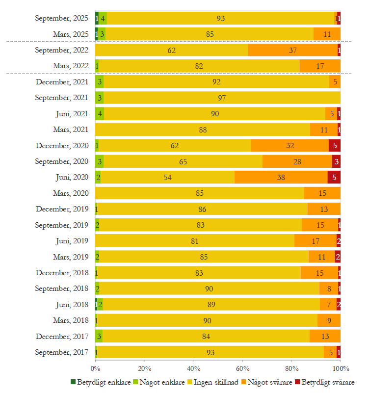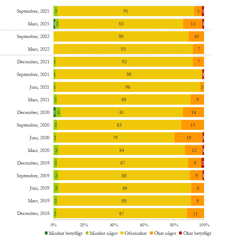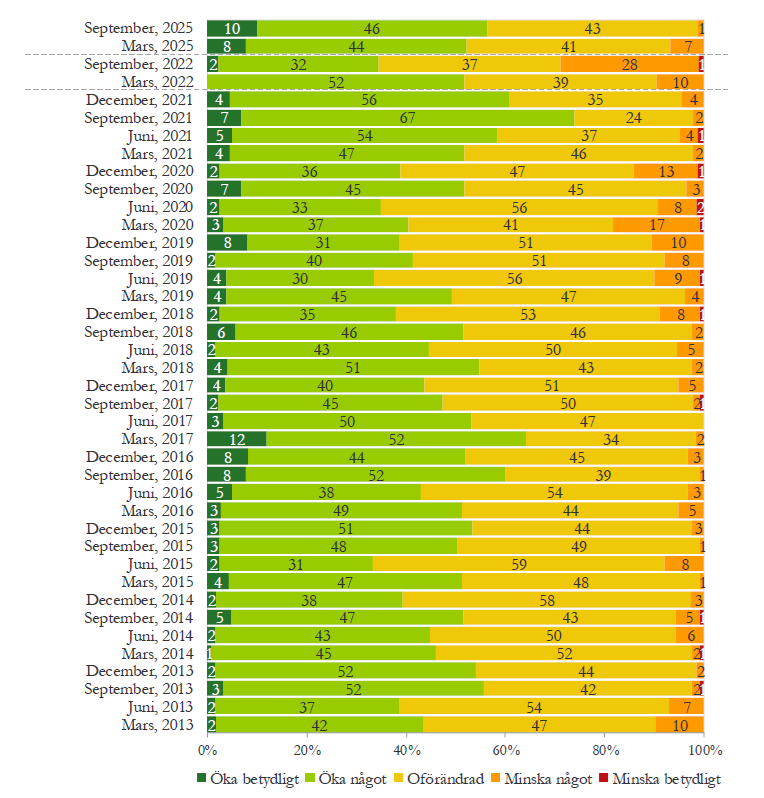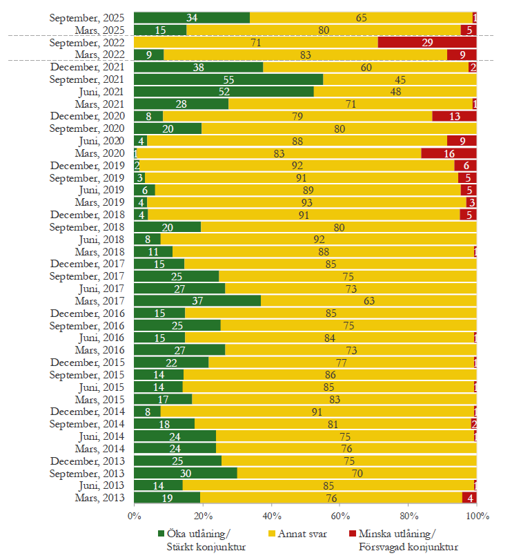 Ungefär hälften av bankkontoren rapporterar oförändrad utlåning till företag under tredje kvartalet 2025, medan fyra av tio har ökat utlåningen, vilket är i linje med föregående mätning. På kort sikt förväntar sig lite mer än hälften av bankcheferna att utlåningen kommer att öka och ännu mer positiv är den långsiktiga bedömningen – mer än 8 av 10 bankchefer förutspår ökad utlåning under det kommande året, vilket är en högre andel jämfört med vårens mätning.