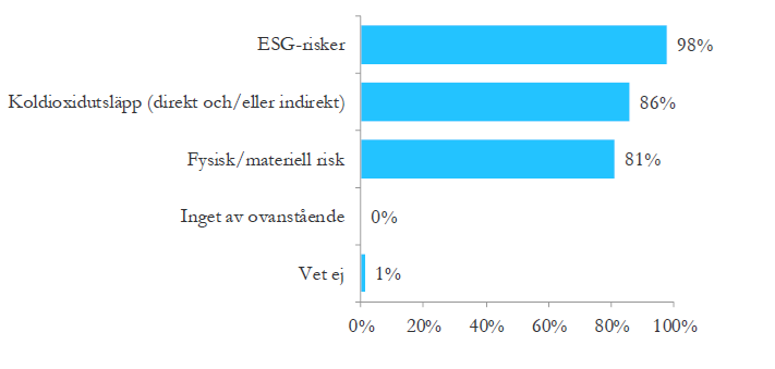 Samtliga chefer för kontor som har utlåning till företag uppger att de tar hänsyns till hållbarhetsaspekter vid utlåning till företag och det gäller i hög utsträckning både ESG-risker, koldioxidutsläpp och fysisk/materiell risk.