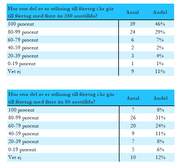 Nära hälften av bankerna som har utlåning till företag har endast utlåning till företag med färre än 250 anställda och en relativt stor del av utlåningen går till företag med färre än 50 anställda.