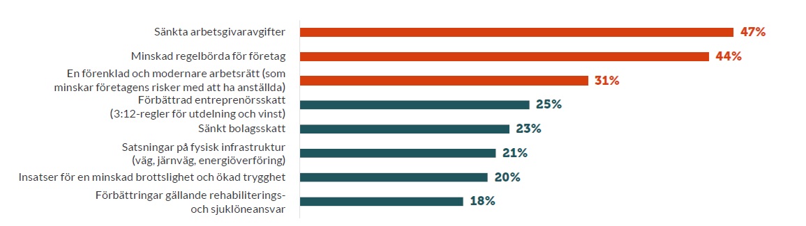 - 44 procent anser att minskad regelbörda för företag är en av de mest angelägna åtgärderna för att få fler företag att växa och anställa.