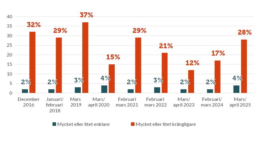 Figur 2. Upplever du att det har blivit enklare eller svårare att driva företag de senaste tre åren?