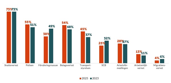 För att få en övergripande förståelse för resultaten har de svarande företagarna fått uppge om de har haft kontakt med respektive myndighet de senaste två åren. Resultatet påminner om mätningen 2023, förutom ett fåtal undantag. Störst förändring står Försäkringskassan för, där 38 procent av de svarande har haft kontakt med myndigheten jämfört med 49 procent 2023. Även SCB uppvisar en minskning från 32 procent till 25 procent. I motsatt riktning går Polisen där andelen som haft kontakt ökar till 55 procent, Bolagsverket till 54 procent och Transportstyrelsen till 54 procent.