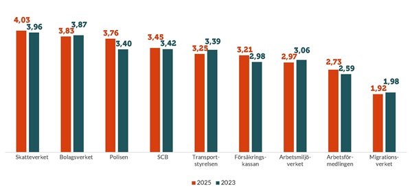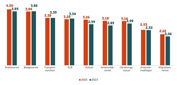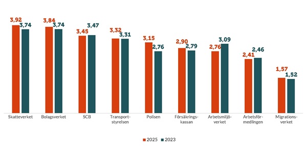Även i denna kategori är det Bolagsverket och Skatteverket som toppar rankingen. Överlag är trenden positiv, där framförallt Polisen sticker ut med ett betyg om 3,15, vilket är en klar förbättring från 2023 där myndigheten fick betyget 2,76. I omvänd riktning går Arbetsmiljöverket, med ett betyg om 2,76, ned från 3,09.