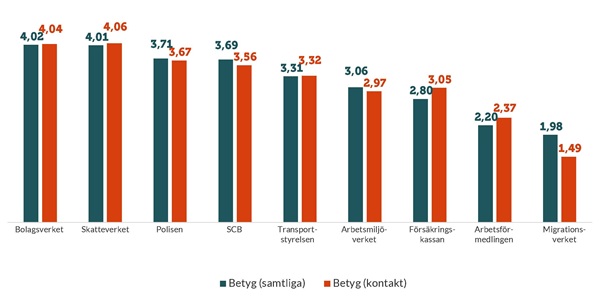 - Bolagsverket och Skatteverket får bäst betyg när det kommer till service, bemötande och förtroende