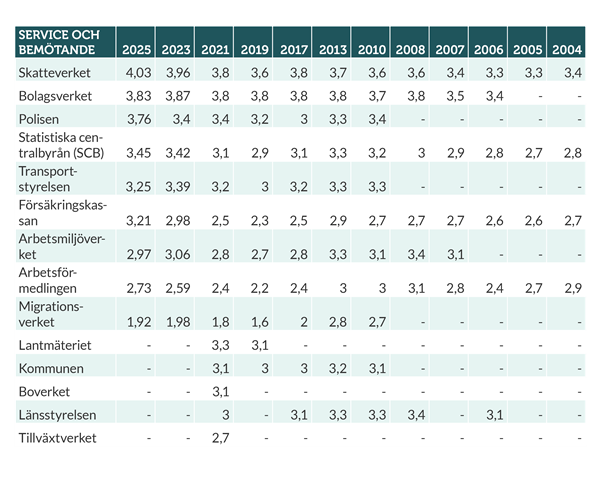 - Betygsättning av myndigheter utifrån service och bemötande (skala 1–5)