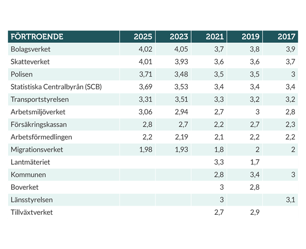 Tabell 2. Betyg på förtroende 2017–2025. Baseras på företagens erfarenheter från respektive myndighet, skala 1–5