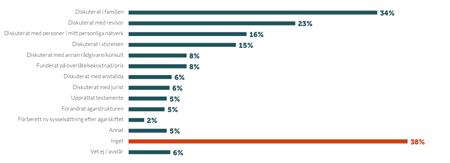 Rangordningen ser ungefär likadan ut som i undersökningen 2022 (se graf nedan), med några noterbara skillnader: Andelen som har fört diskussioner inom familjen har ökat påtagligt, från 34 till 45 procent, medan andelen som inte har vidtagit några åtgärder alls är betydligt lägre i år. (Här ska dock noteras att basen för frågan är olika i de respektive undersökningarna. I 2022 års undersökning ställdes frågan till alla svarande, drygt 1 300, medan i årets undersökning ställdes den enbart till de företagare som angett att ägarskifte kan bli aktuellt inom kommande tio år, drygt 600.)