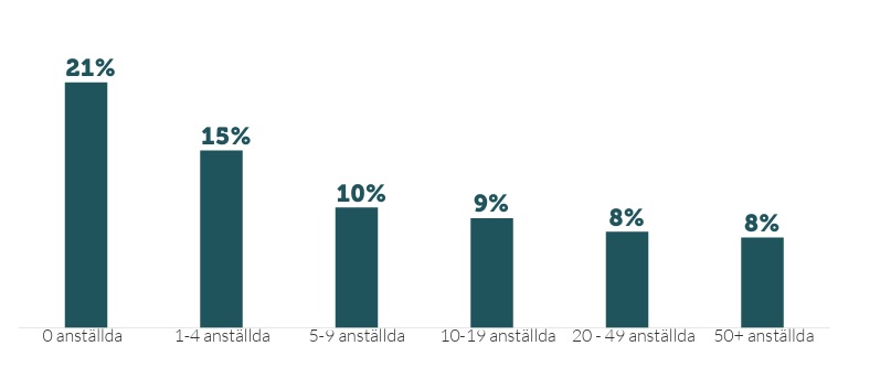 Vi väljer även att ta bort företag med en låg omsättning (under 100 000 kronor) och stora företag med en omsättning över 1 miljard kronor. Företag som har ett negativt resultat som understiger -1 miljard kronor exkluderas också från undersökningen. Därtill exkluderas cirka 24 000 huvudkontor och holdingbolag. Av kvarvarande företag saknar 18 000 företag F-skatt, samt ytterligare några hundra företag som saknar relevanta uppgifter om företagsledaren. Sammantaget omfattar analysen cirka 420 000 företag.