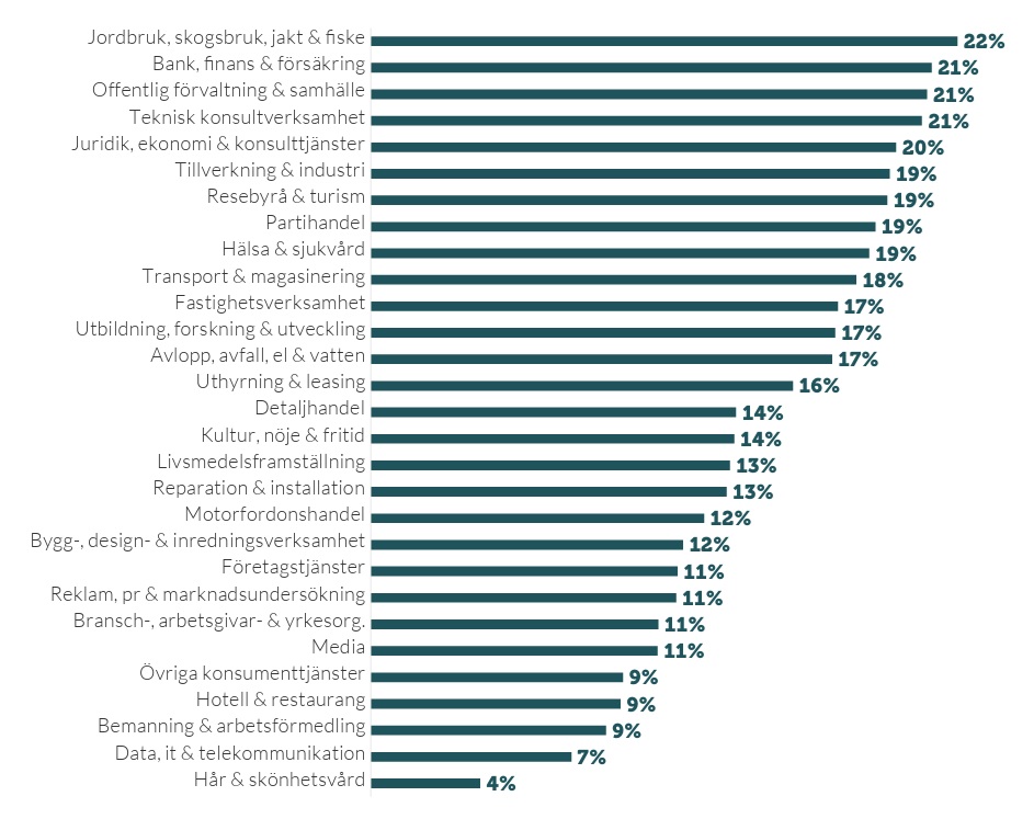En sektor där ägarskiftesfrågor är särskilt relevanta är jord- och skogsbruk. Drygt 40 procent av alla jordbrukare som drev enskild firma 2025 var 65 år eller äldre – en ökning från 27 procent femton år tidigare. (Jordbruksverket, 2025.) Inom dessa företag finns ofta ett stort kapitalunderlag, och mycket processkunskap som är tidskrävande att överföra, samtidigt som avkastningen kan vara osäker. En ägarskiftesprocess inom jordbruk kan ta allt mellan ett och 15 år, beroende på förutsättningarna. Vanligast är alltjämt ägarskifte inom familjen. Antalet jordbrukare har minskat med drygt 40 procent de senaste årtiondena, samtidigt som priserna på åkermark stigit lika mycket de senaste tio åren. Denna utveckling har gjort det allt svårare för syskon att lösa ut varandra vid ett generationsskifte. Särskilt svårt är att hitta finansieringslösningar.(Dahlman och Sollenberg, 2025; Carlsson, 2025.) I LRF Ungdomens enkätundersökning bland unga lantbrukare 2023 angav 81 procent att brist på kapital är det största hindret för unga som vill ta över ett lantbruksföretag. (LRF Ungdomen, Många vill – men få kan, 2023.)