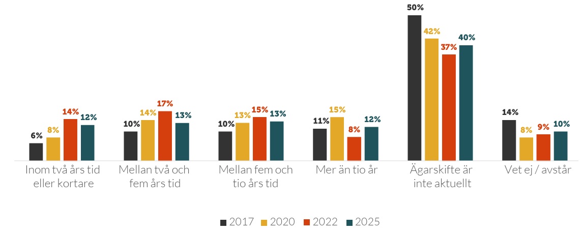 • Fyra av tio ser inte ägarskifte som aktuellt. Andelen är lite högre än 2023 men betydligt lägre än 2017.