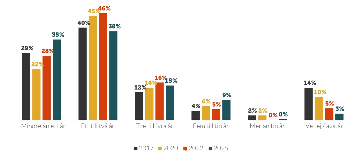 • En stor majoritet, nästan nio av tio, bedömer att ett ägarskifte skulle ta under fem år. Det är aningen oroväckande att så stor andel är av denna uppfattning, och att nästan tre av fyra uppfattar att det skulle kunna ske på max två år. Andelen som uppfattar att det tar mindre än ett år har också ökat markant.