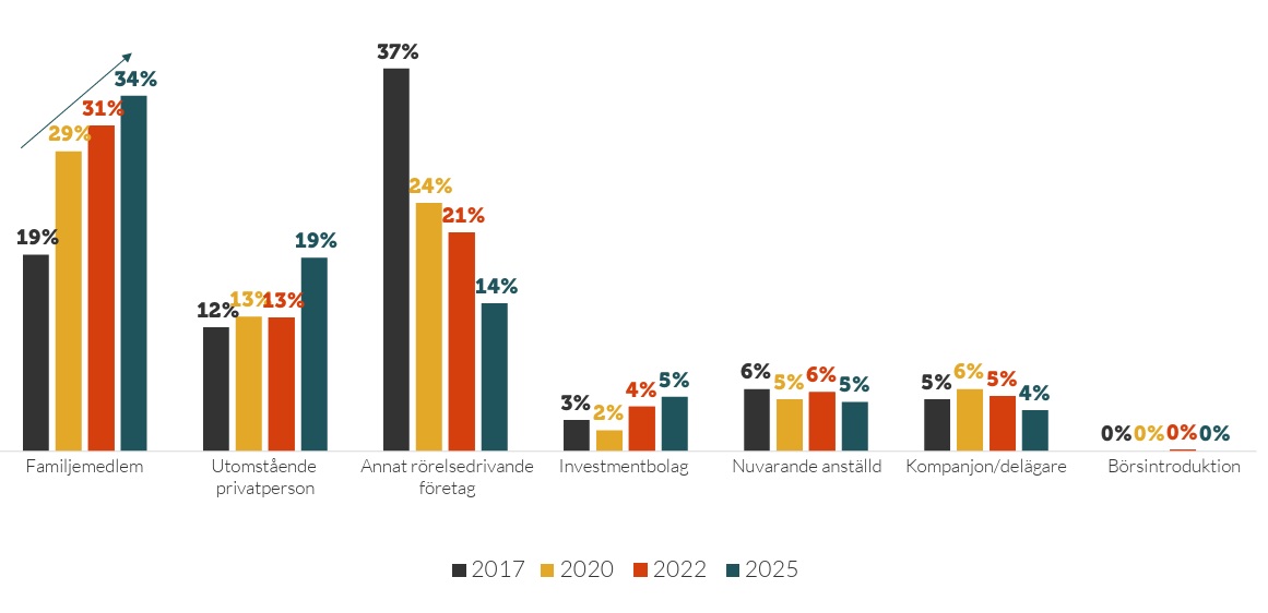 • Det vanligaste alternativet för överlåtelse är till familjemedlem. Drygt var tredje svarar detta. Överlåtelse inom familjen som det primära alternativet har stadigt ökat sedan undersökningen 2017. De förbättrade skattereglerna för överlåtelse till närstående som genomfördes 2019 spelar sannolikt en stor roll för detta resultat, och att trenden fortsätter kan vara en effekt av de förändringar av 3:12-reglerna som aviserades under 2025.