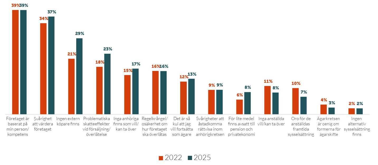 En jämförelse av resultaten från undersökningarna 2022 och 2025 visar dock att andelen som anger brist på externa köpare respektive problematiska skatteeffekter vid försäljning som skäl har ökat. Det förstnämnda stämmer väl överens med resultatet ovan, att färre ser försäljning till annan rörelsedrivande aktör som det troliga ägarskiftesalternativet. Det senare är mer svårtolkat, då vi inte har statistik om vilka specifika skatteregler det är som avses. Av resultaten kan dock utläsas att svarande som är överrepresenterade i denna kategori är yngre företagare, företagare i branschkategorin Vård & Omsorg, Utbildning, Personliga & kulturella tjänster, Övriga konsumenttjänster, samt i företagen med högst omsättning.