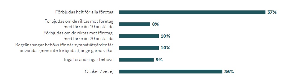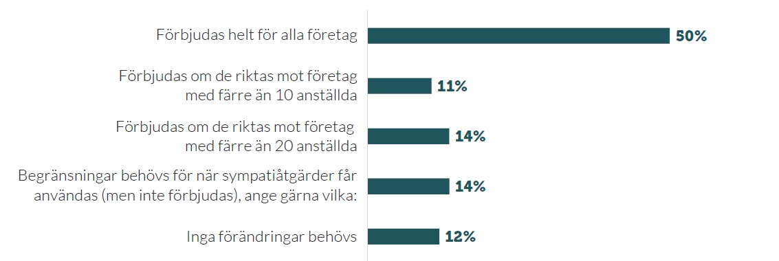 Panelundersökningen 2026 visar att en tydlig majoritet av företagen vill begränsa eller förbjuda sympatiåtgärder. Företagarna har antagit ett 25-punktsprogram som säger att stridsåtgärder riktade mot företag med färre än 10 anställda bör förbjudas helt.