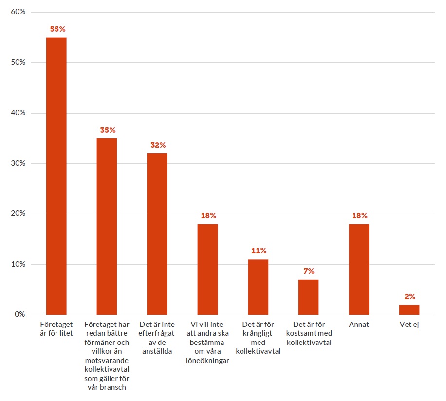 Som grafen visar anser en klar majoritet att deras företag är för litet för att de ska vilja teckna kollektivavtal, att de har bättre villkor än vad kollektivavtalet har samt att de anställda inte efterfrågar kollektivavtal. Dessa svar tyder på att företagens skäl för att inte teckna kollektivavtal i huvudsak hänför sig till storleken på företaget.