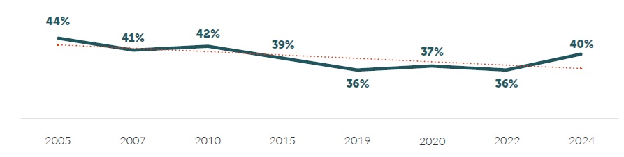 Tidsserien visar att kollektivavtalstäckningen bland småföretag varit relativt stabil över tid och att den inte närmat sig den höga täckningsgrad som finns bland större företag (Demoskop 2024).