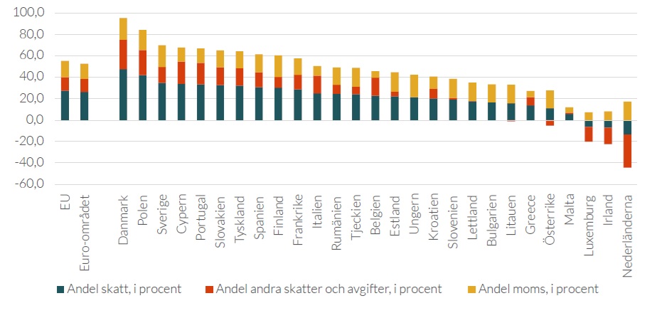 De flesta medlemsstaterna i EU har en betydande beskattning av energi. Sverige hör dock till toppen när det kommer till skattenivån, och av de två länderna som har högre andel skatter av elkostnaden har ett av dem, Danmark, beslutat att sänka skatten på el till EU:s miniminivå med budgeten för 2026 (Finanslovforslaget 2026). Om Polens president Karol Nawrocki lyckas få igenom sina förslag om att sänka kostnaden för el med 33 procent, riskerar Sverige snart att ha högst elskatt i EU. Flera av de medlemsstater som har liknande skattenivåer som Sverige planerar för skattesänkningar av deras energiskatter i närtid (Svenska Dagbladet). Tyskland, som har störst skatteintäkter för el i EU (Eurostat) aviserade 2025 för skattesänkningar på el för 42 miljarder euro 2026 till 2029 (Dagens Industri) och subventioner av elnätsavgifter på 6,5 miljarder euro 2026 (Reuters; Federal Ministry of Finance).